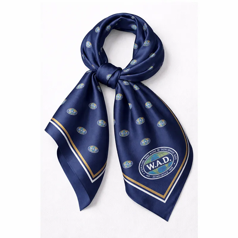 Elegant silk foulard in classic navy blue featuring the refined W.A.D. emblem pattern and decorative borders. A stylish accessory designed for W.A.D. members, perfect for conferences, formal gatherings, or everyday elegance.