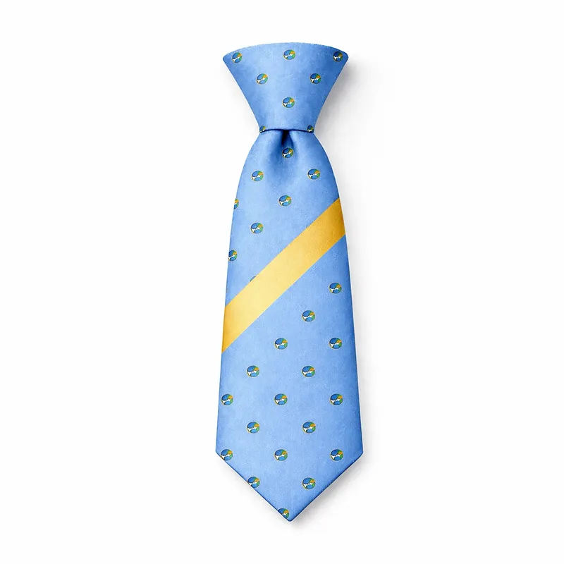 Exclusive tie reserved for Past Presidents of the World Association of Detectives. The distinguished design features the W.A.D. emblem pattern combined with a bold gold diagonal stripe symbolizing leadership and service to the association. Available in light blue, navy blue, and burgundy.